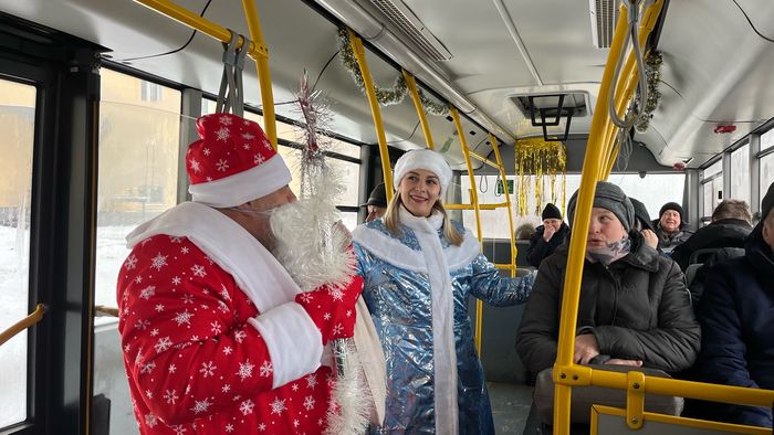 Чтобы создать праздничную атмосферу и поднять настроение пассажирам, троллейбусы в эти дни украшены новогодней символикой. В пятницу утром в салонах также звучали известные зимние композиции, а пассажиры вместе с Дедом Морозом и Снегурочкой отгадывали загадки.