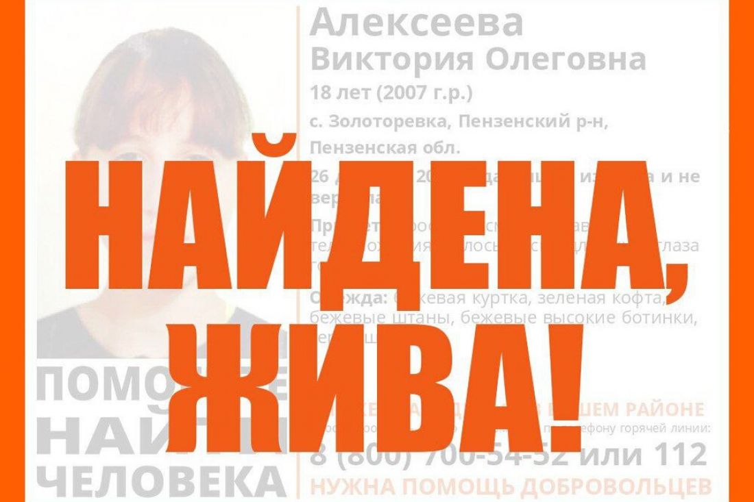 Как сообщили представители поискового отряда «ЛизаАлерт Пенза» в своем официальном телеграм-канале 29 декабря в 15:41, Виктория Алексеева найдена, и она жива.