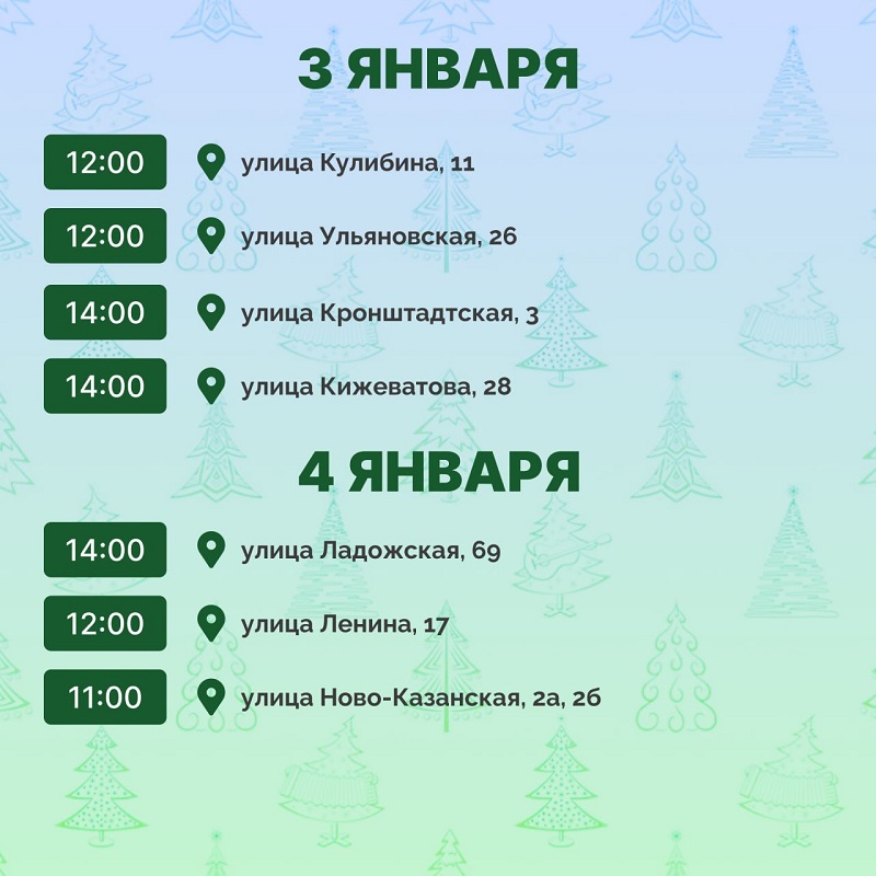 3 января праздники проведут по адресам: улица Кулибина, 11; улица Ульяновская, 26; улица Кронштадтская, 3; улица Кижеватова, 28.