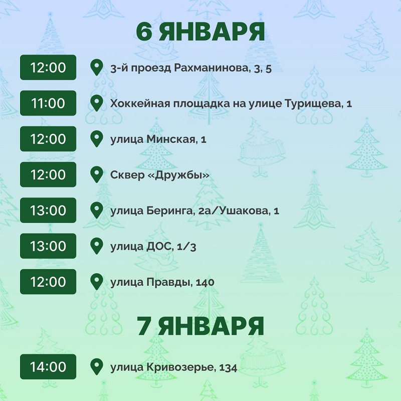 6 января праздники пройдут на улице Ладожской, 164, 33; в 3-м проезде Рахманинова, 3, 5; на улице Турищева, 1; на улице Минской, 1; в сквере «Дружбы»; на улице Правды, 140; на улице ДОС, 1/3; на улице Беринга, 2а/Ушакова, 1.