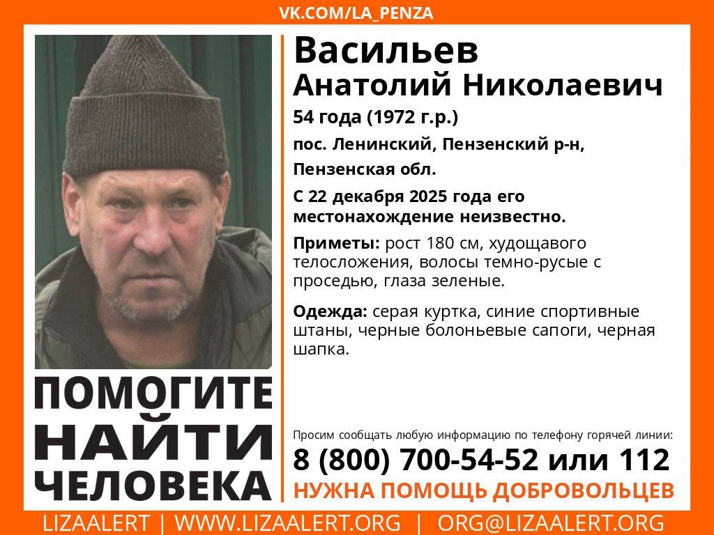 Информация об исчезновении Анатолия Васильева 1972 года рождения появилась в официальном телеграм-канале поискового отряда «ЛизаАлерт Пенза». Известно, что мужчина проживает в поселке Ленинский Пензенского района и с 22 декабря прошлого года его никто не видел.