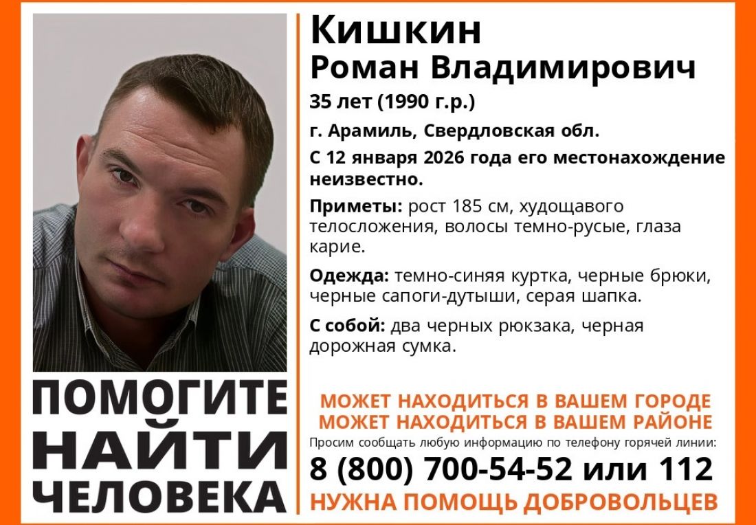 Мужчина проживает в городе Арамиль Свердловской области. Его местонахождение неизвестно с 12 января 2026 года.