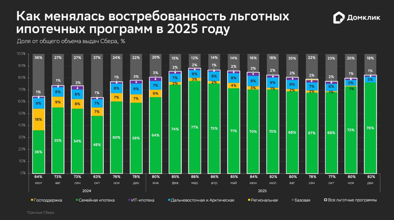Динамика объёмов выдач по льготным программам по РФ за 2024-2025 гг. (данные Сбера). Динамика доли выдач по программе «Господдержка» показана жёлтым, по «Семейной ипотеке» – зелёным, по IT-ипотеке – фиолетовым, по «Дальневосточной и Арктической» – голубым, выдачи на общих (базовых) условиях показаны серым. Числовые значения показаны для случаев, когда значения превышают 1%. Данные по «Региональной ипотеке» по большинству месяцев не приводятся, поскольку доля выдач не превышает 1%.