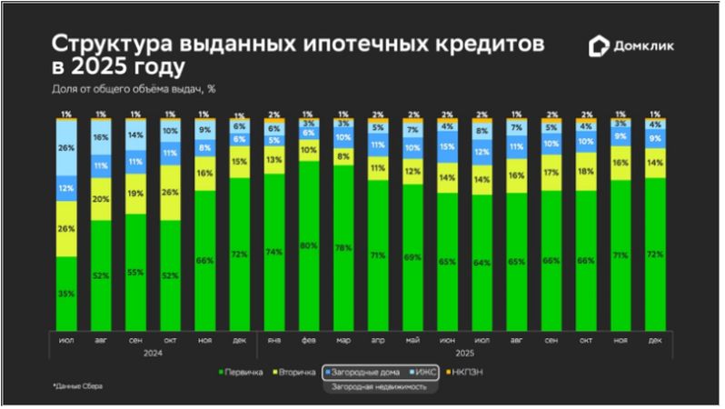 Аналитический центр Домклик продолжает рассказывать о наиболее важных изменениях на российском рынке недвижимости во II полугодии 2025 года. Во второй части регулярного исследования аналитики изучили, как распределились выдачи Сбера между рынками первичного, вторичного и загородного жилья.