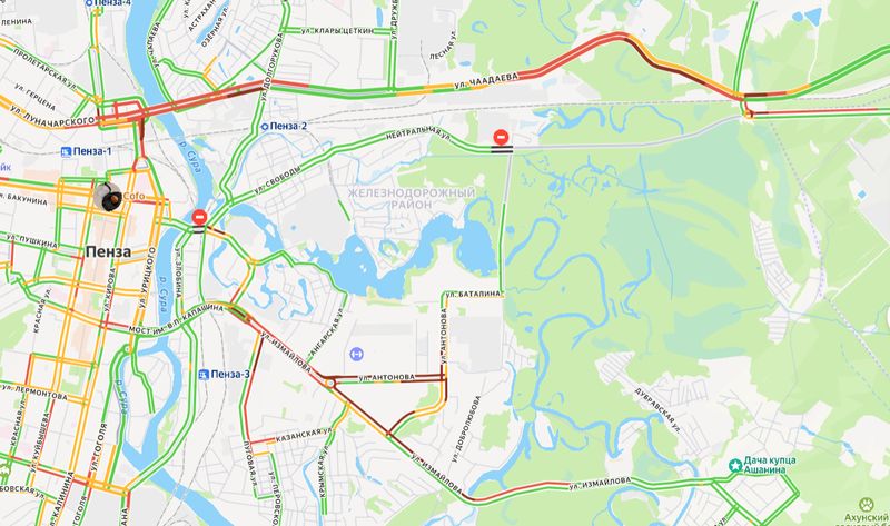 Причиной возникновения заторов можно считать временное закрытие участка пути из Заречного в Пензу недалеко от Ахунского переезда. Из-за этого многие зареченцы отправились сегодня на работу в областной центр через район Ахуны и далее по улице Измайлова и Антонова, а также по улице Чаадаева, в том числе городской общественный транспорт.