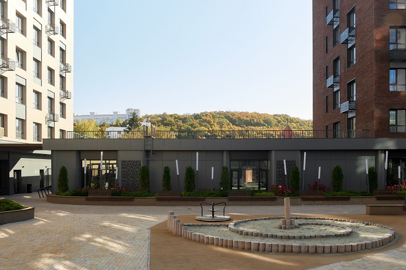 Успех проекта в рейтинге обеспечило соответствие жестким требованиям. Комплекс формирует тихую и безопасную среду благодаря буферным зонам между домами и дорогой, где расположены широкие тротуары, зоны отдыха и озеленение. На первых этажах по периметру создана коммерческая линия с объектами шаговой доступности.