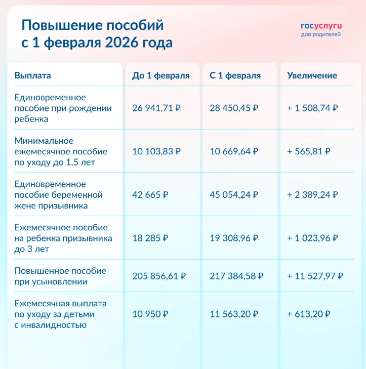 Также выросло единовременное пособие при рождении ребенка. При рождении ребенка до 1 февраля 2026 пособие составляло 26 941,71 рублей. При рождении ребенка с 1 февраля 2026 — 28 450,45 рублей. Если родилось несколько детей, пособие назначается на каждого.