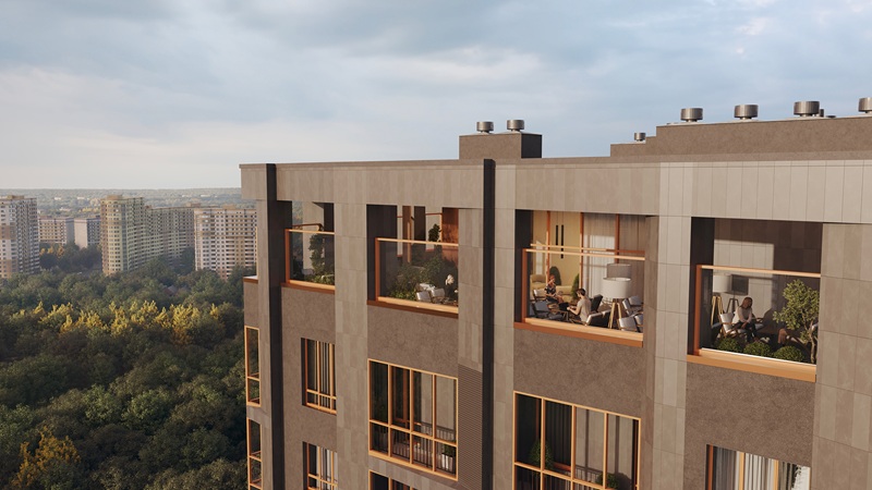 О втором мы уже напоминали, оно венчает самую высокую башню и становится смотровой площадкой для жителей. В квартале «Модернист» любоваться панорамой города можно, даже если квартира находится на нижних этажах.