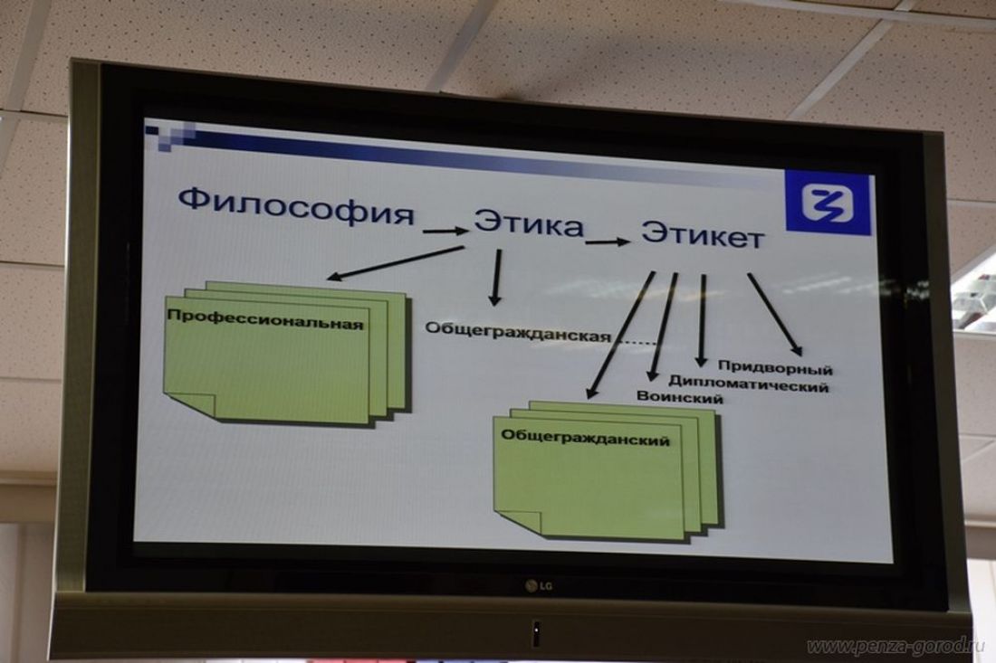 Лекцию провела декан факультета вычислительной техники Пензенского государственного университета Людмила Фионова. Она рассказала о значении этических норм в современной управленческой деятельности, уделив внимание деловому этикету, культуре речи, невербальному общению и способам разрешения конфликтов. Также речь шла о формировании положительного имиджа специалиста.
