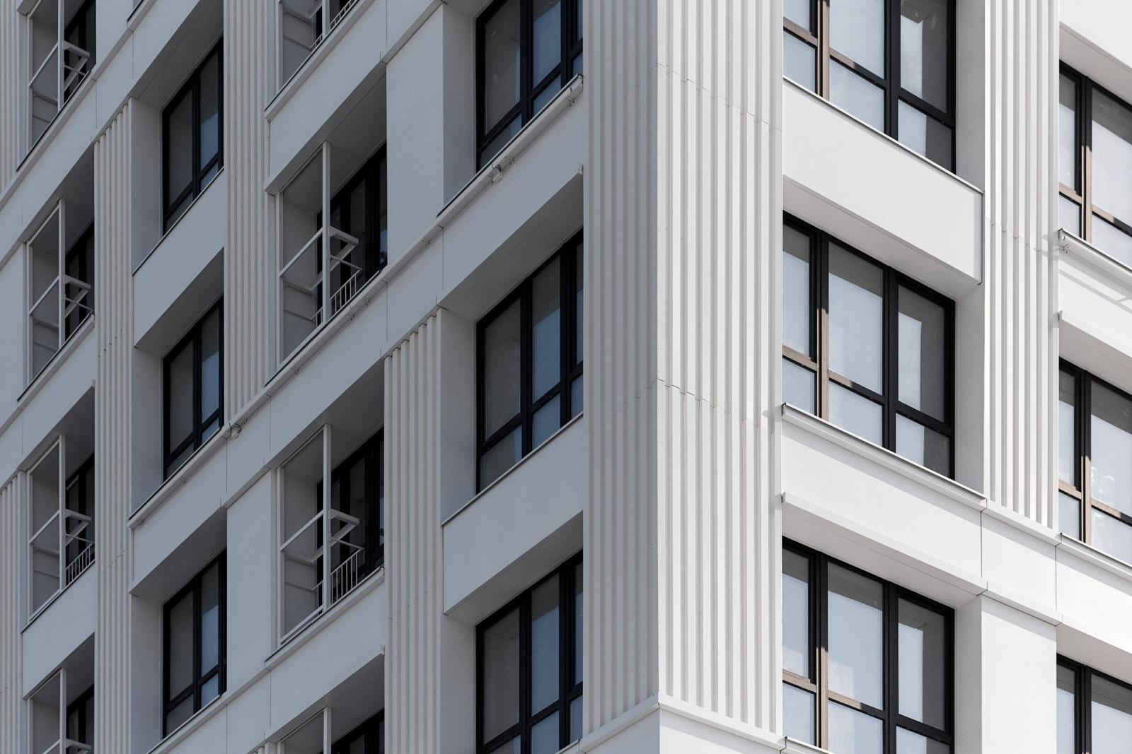 На объекте параллельно ведется большой пул работ — от устройства инженерных систем до внутренней отделки, но внешне наиболее заметен монтаж фасада. Первая башня уже оделась в белоснежные панели, что позволило оценить изящные архитектурные решения, включая визуально скрытое размещение внешних блоков кондиционеров.