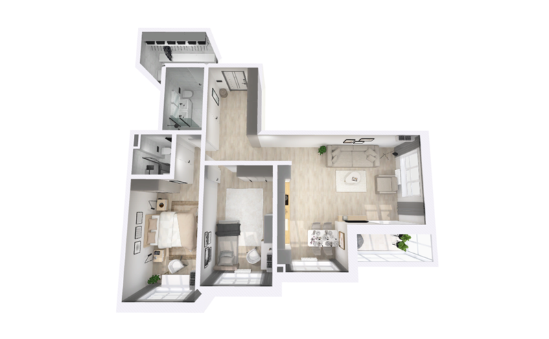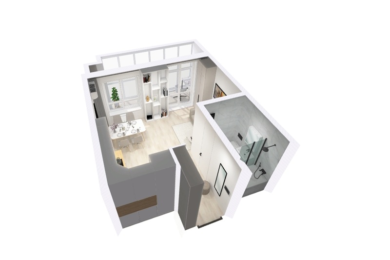 Студии здесь превышают по площади привычные большинству однокомнатные квартиры. Более того, они не вытянутой формы, а стремятся к форме квадрата. Благодаря этому можно грамотно зонировать пространство и даже разделить спальню и кухню, ведь в студии два окна.