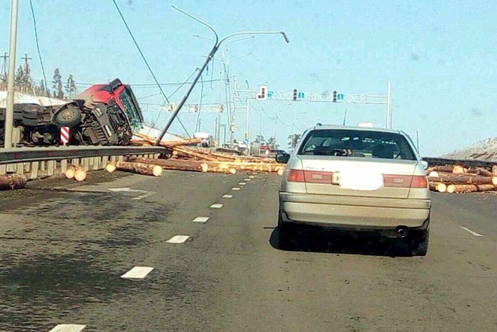 На федеральной трассе опрокинувшийся лесовоз полностью парализовал движение