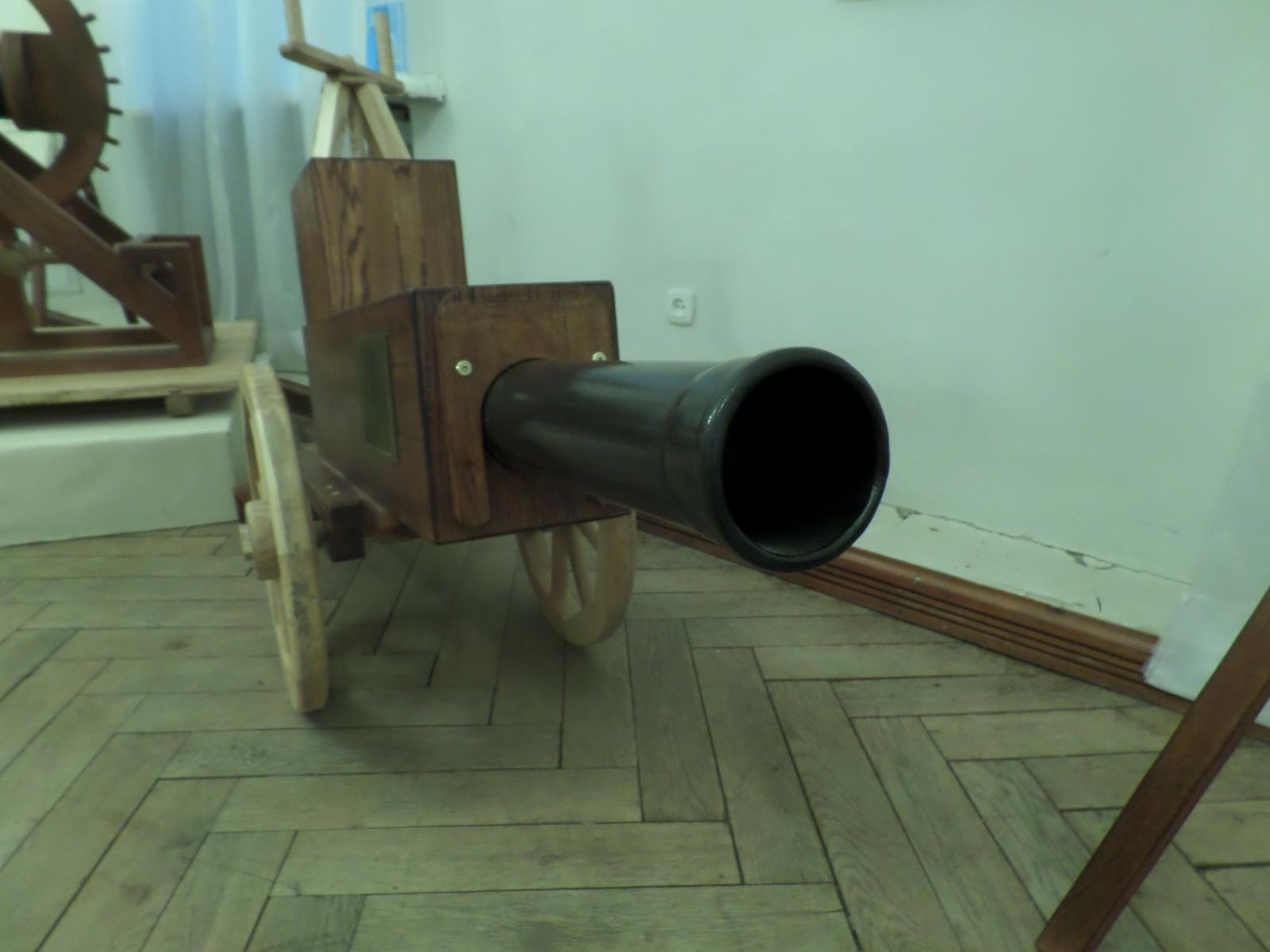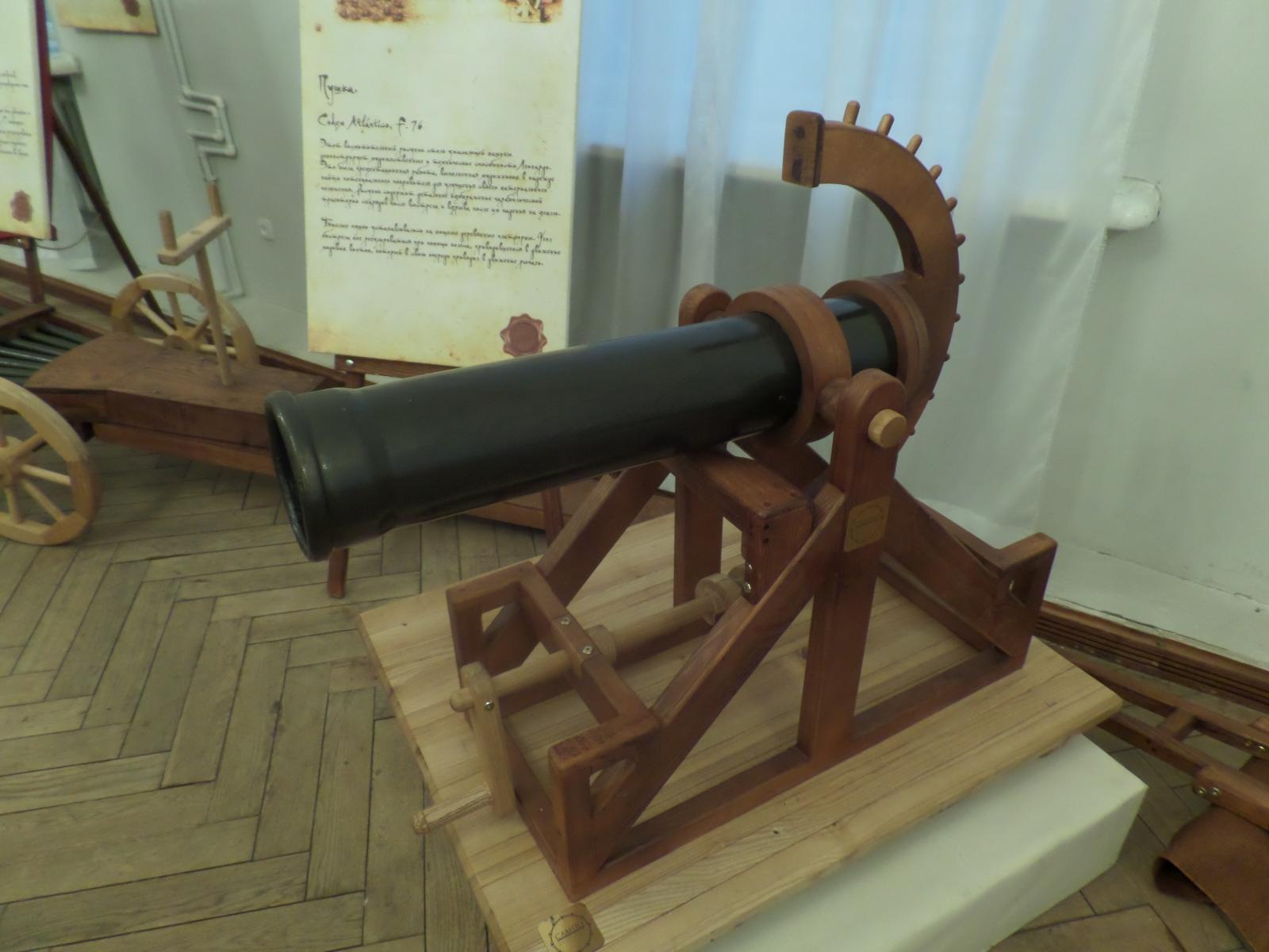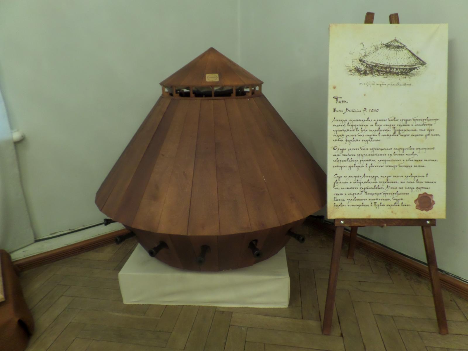 На выставке в очередной раз можно убедиться, насколько изобретатель эпохи Возрождения опередил свое время. Многозарядные орудия, приспособления для полетов, паровая пушка и, наконец, модель, на первый взгляд похожая на летающую тарелку, которая на деле оказалась средневековым танком.