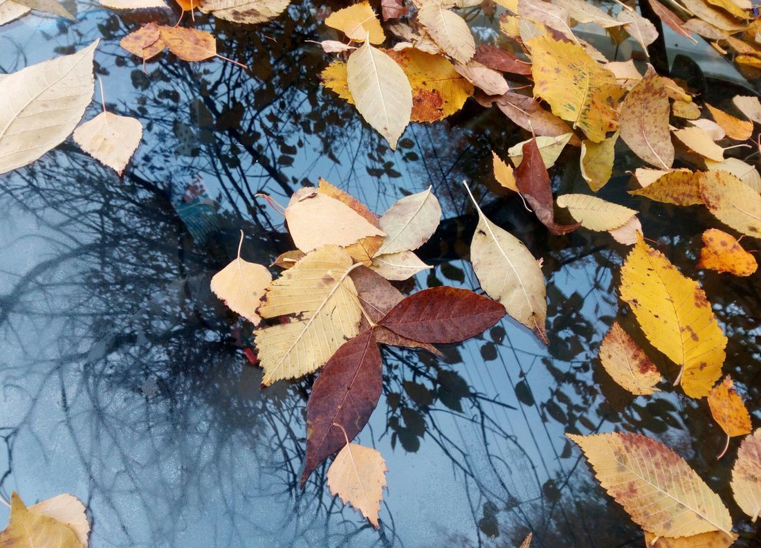 Так, например, отражение пасмурного неба и обнажающихся ветвей в усыпанном листвой стекле автомобиля напоминает: настоящая осень ближе, чем кажется.