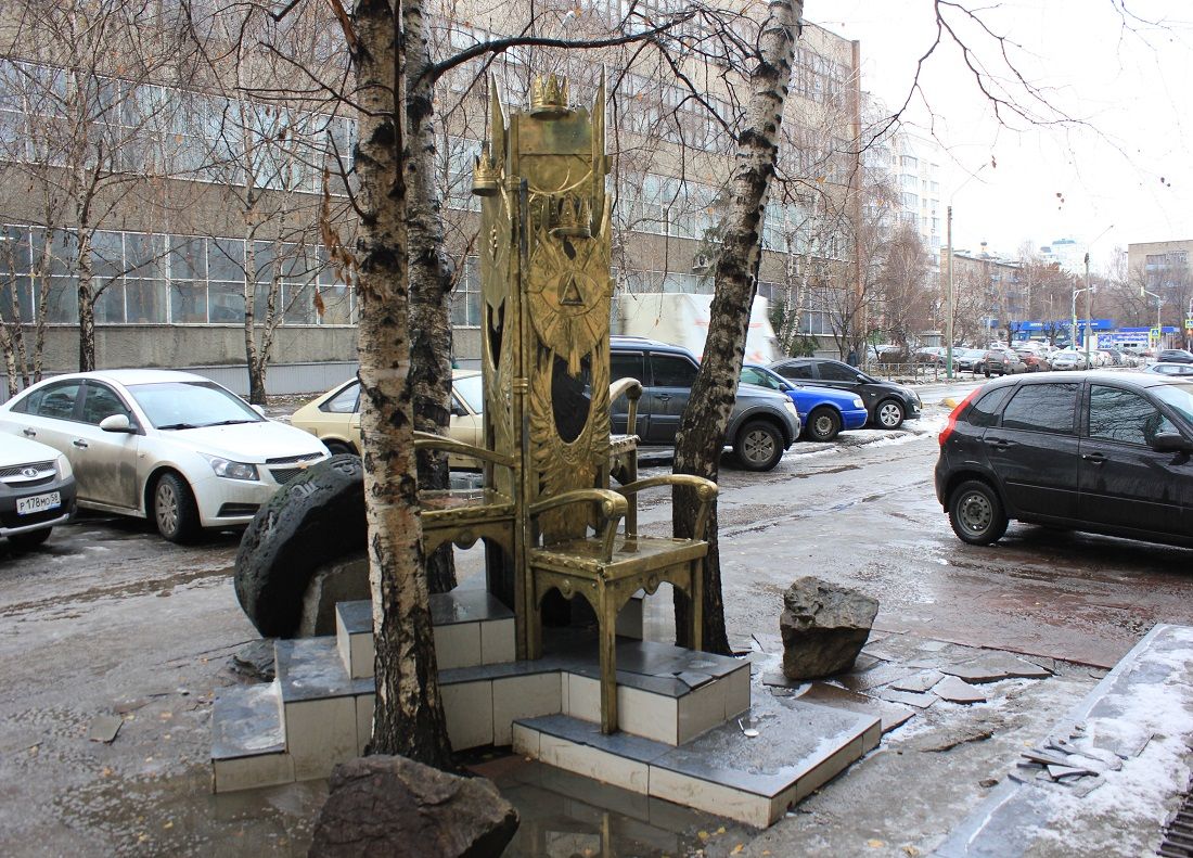 На третьем троне - знак, похожий на топографический символ хвойного леса из школьного учебника географии. Впрочем, в теории заговора и ему наверняка место найдется. А вот случайный прохожий, видимо, без бутылки не разберется. Кстати, следы попыток постигнуть истину нашлись на подлокотнике одного из сидений.