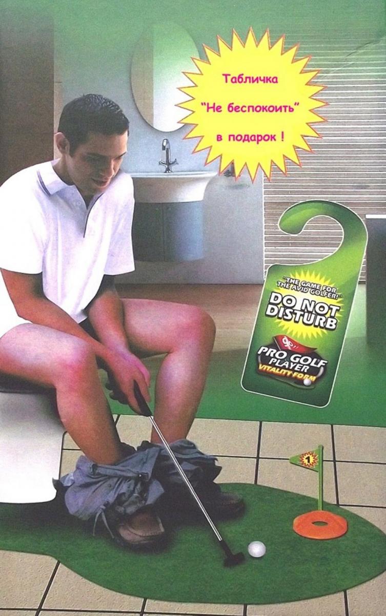1. И наконец, абсолютный хит – гольф для туалета. В комплект входит табличка «Не беспокоить!». Представьте - звонок, вы поднимаете трубку и говорите: «Я на гольфе у седьмой лунки!».