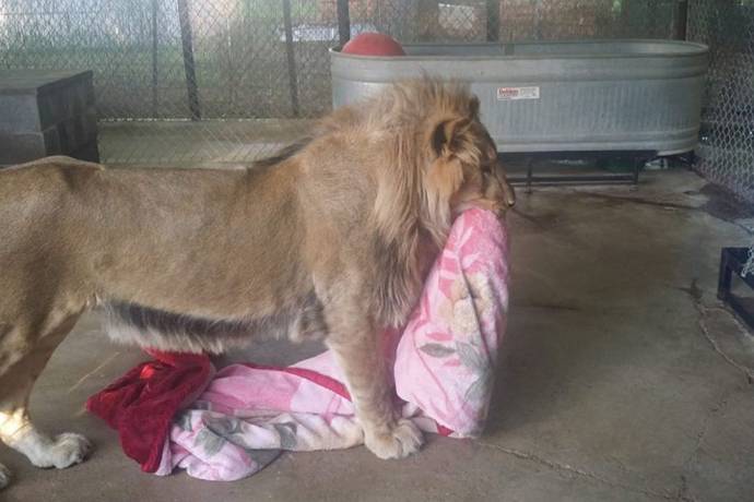 Лев Ламберт в техасском зоопарке привык укутываться в одеяло на ночь