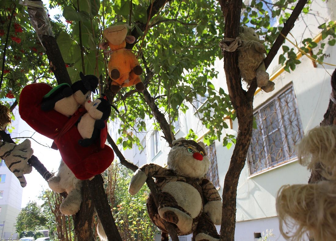 Благоустройство некоторые жители Пензы понимают как-то совсем своеобразно. Поначалу, видимо, после программы «Очумелые ручки», во дворах многоэтажек начали появляться лебеди из автомобильных покрышек. Черные птицы были лишь зловещим знамением. За ними в палисадниках рядом с домами выросли цветы из пластиковых бутылок. Развитию этого жанра народного творчества можно посвятить несколько томов научных исследований, впрочем, с такими арт-объектами еще хоть как-то можно смириться. Однако неизвестные господа-оформители пошли еще дальше: на деревьях стали вешать отжившие свой век детские мягкие игрушки.