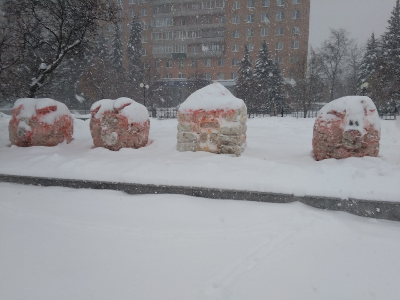 Композиция скульптур из снега «Три поросенка» пугает прохожих.