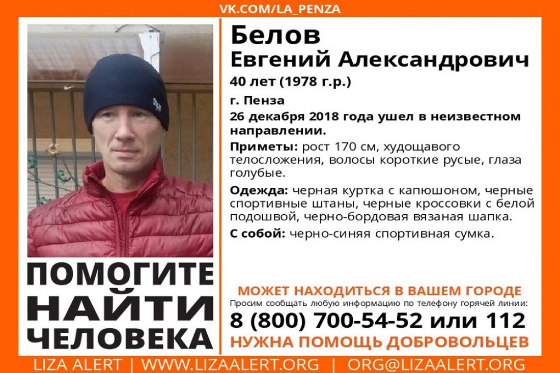 Волонтеры разыскивают Евгения Белова, 1978 года рождения. Он ушел из дома 26 декабря 2018 года и не вернулся. Ориентировка появилась в пензенской группе поискового отряда «Лиза Алерт» социальной сети «ВКонтакте».