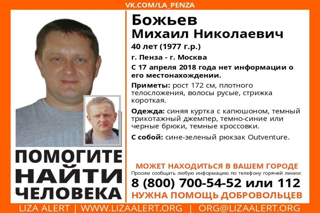 В Пензе ищут 40-летнего Михаила Божьева, который 17 апреля 2018 года ушел из дома. До настоящего времени информации о его местонахождении нет. Об этом сообщают волонтеры поискового отряда «Лиза Алерт Пенза».