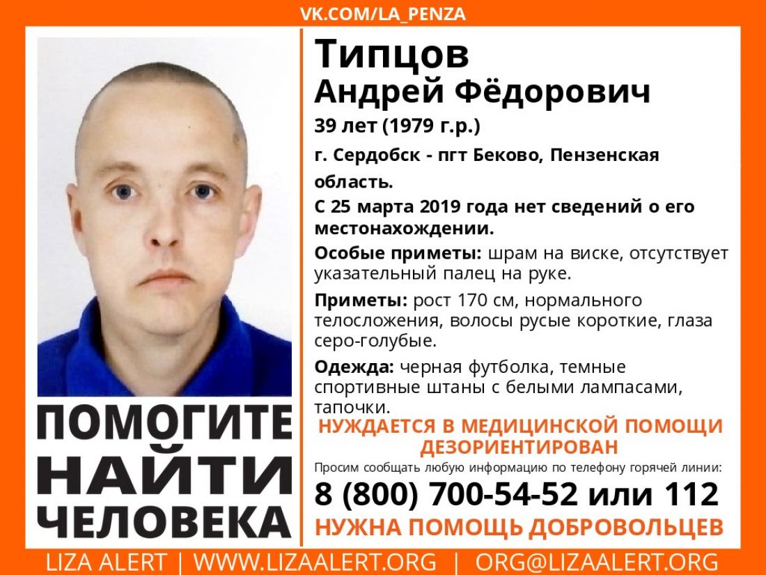 В Сердобске Пензенской области сегодня пропал 39-летний Андрей Типцов. В группе поискового отряда «Лиза Алерт» в социальной сети «ВКонакте» опубликованы приметы мужчины: рост 170 сантиметров, нормального телосложения, короткие русые волосы, серо-голубые глаза. Среди особых примет – шрам на виске, а также отсутствует указательный палец на руке.