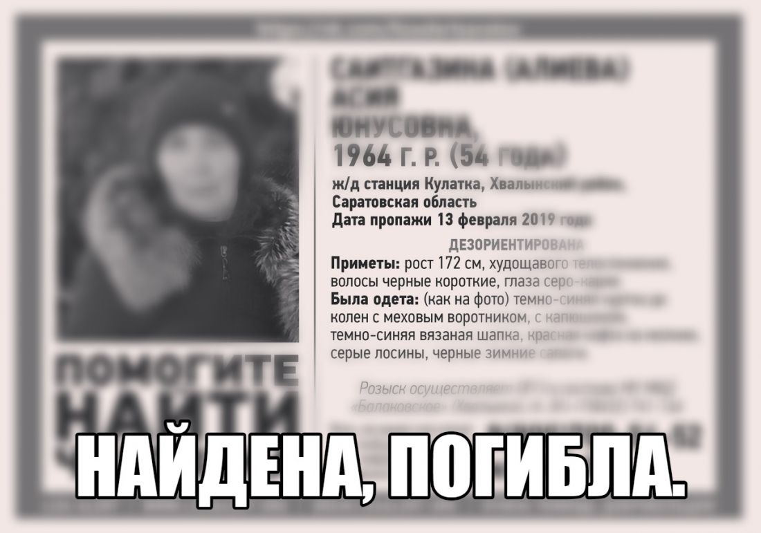 Поисковый отряд «Лиза Алерт» сообщил печальную новость – найдена погибшей 54-летняя Асия Саитгазина (Алиева). Дезориентированная женщина пропала 13 февраля вблизи железнодорожной станции «Кулатка», расположенной в Хвалынском районе Саратовской области.