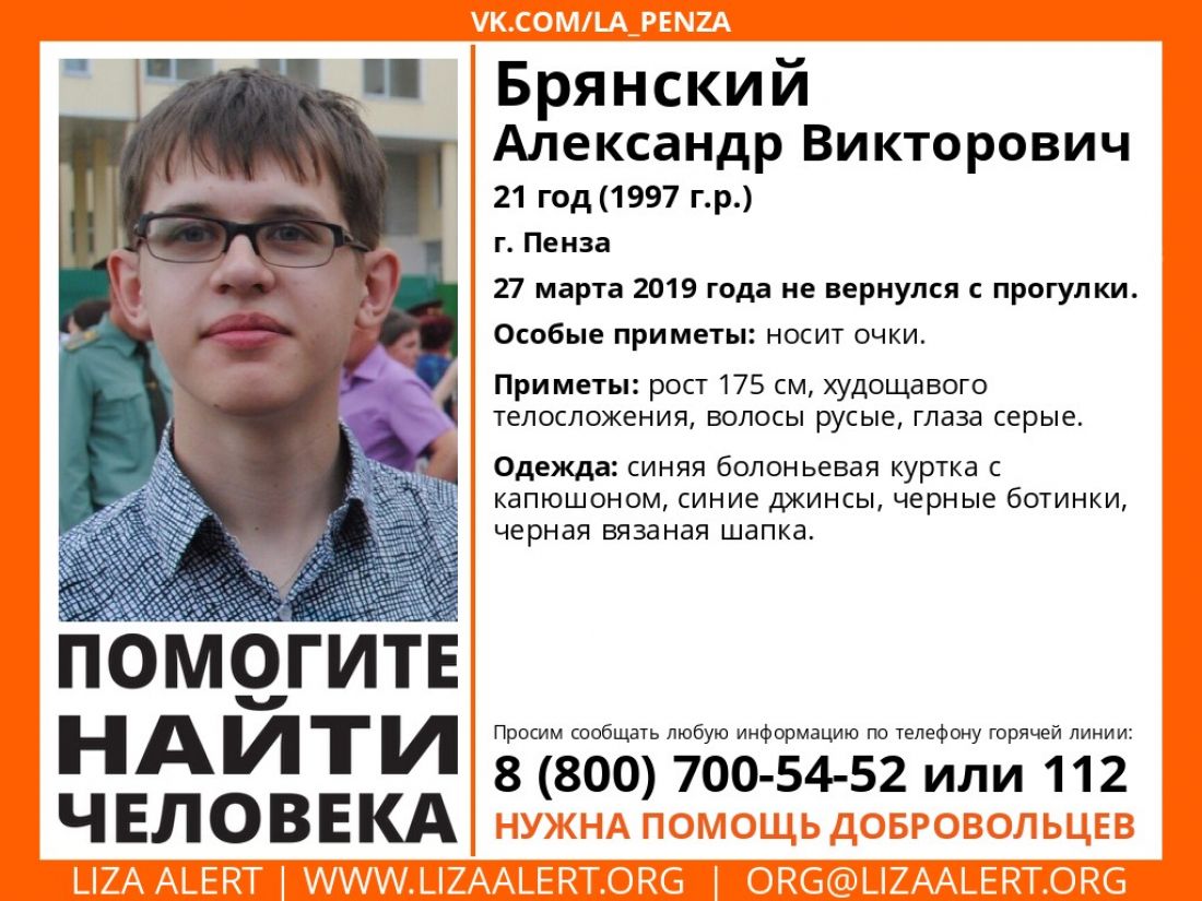Пензенские волонтеры подключились к поискам 21-летнего Александра Брянского