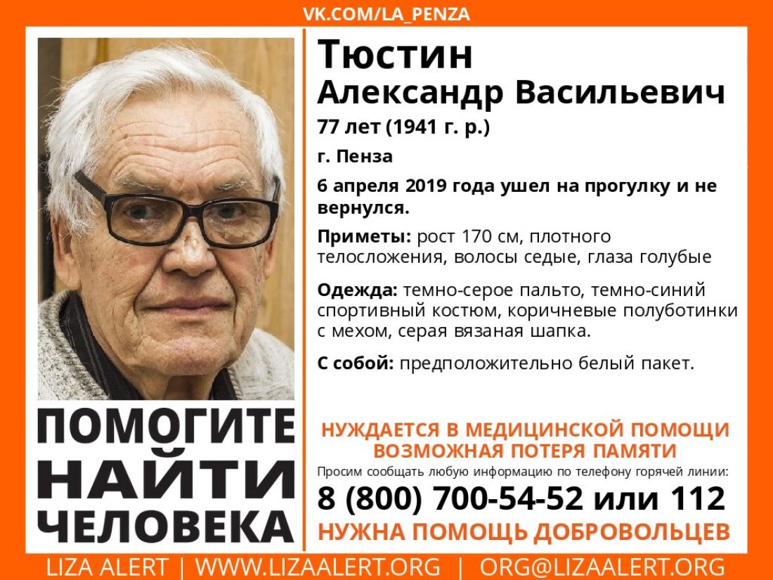Волонтеры отряда «Лиза Алерт» сообщили о поиске 77-летнего жителя Пензы. Известный историк, писатель и журналист, главный специалист Пензенского государственного объединенного краеведческого музея Александр Тюстин сегодня утром вышел из дома на прогулку и не вернулся. Приметы пропавшего: рост 170 сантиметров, плотного телосложения, седые волосы, голубые глаза. Он был одет в темно-синее пальто, темно-синий спортивный костюм, коричневые полуботинки с мехом и серую вязаную шапку, с собой у него, предположительно, был белый пакет.