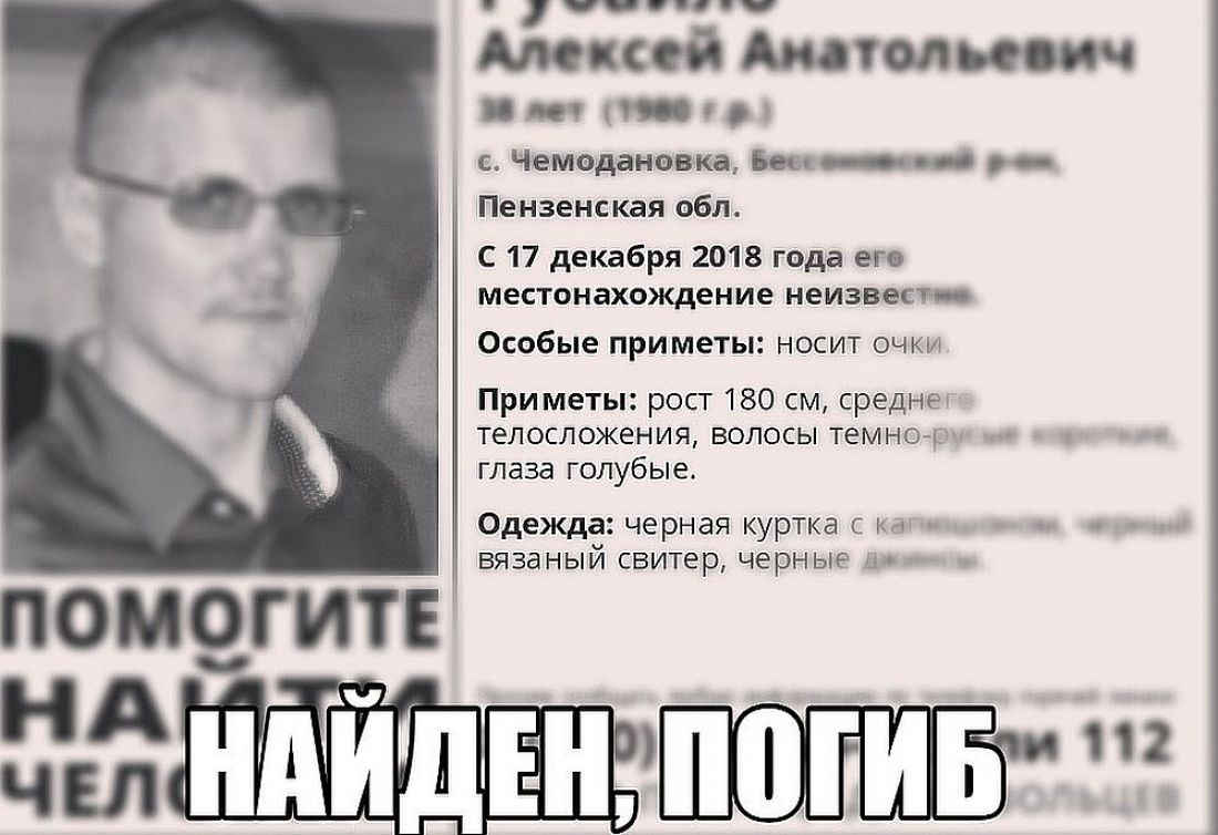 13 апреля в группе «Лиза Алерт Пенза» социальной сети «ВКонтакте» появилось тревожное сообщение под ориентировкой об исчезнувшем 38-летнем жителе села Чемодановка Бессоновского района Алексея Рубайло. «Найден. Погиб», - извещал подписчик сообщества. На следующий день эту информацию подтвердили и сами поисковики.