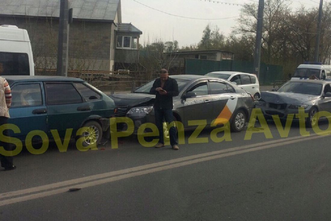 В субботу, 27 апреля, в пензенском микрорайоне Терновка произошло дорожно-транспортное происшествие с участием трех автомобилей. Очевидец опубликовал в группе «Сова Пенза авто» социальной сети «ВКонтакте» снимок с места ДТП. Судя по нему, на дороге столкнулись «ВАЗ-2109», «BMW» и, предположительно, «Geely Emgrand» с символикой «Яндекс. Такси».