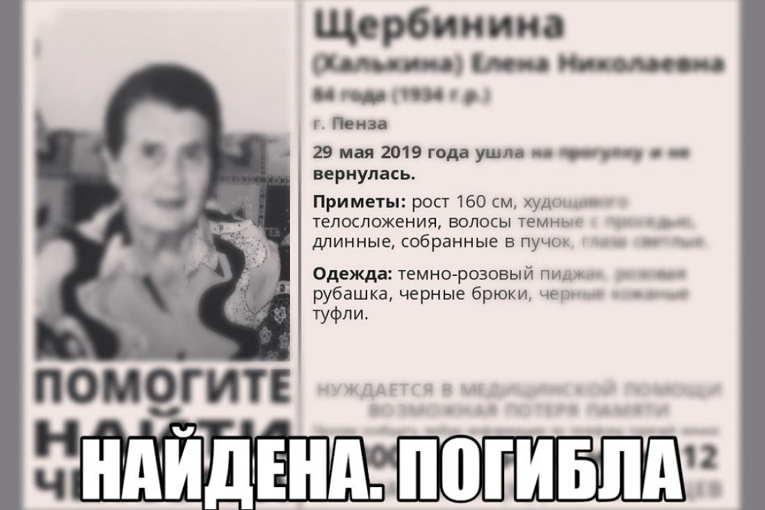 4 июня 2019 года в группе пензенского поискового отряда «Лиза Алерт» социальной сети «ВКонтакте» появилось тревожное сообщение под ориентировкой на исчезнувшую 84-летнюю пенсионерку Елену Щербинину из областного центра.