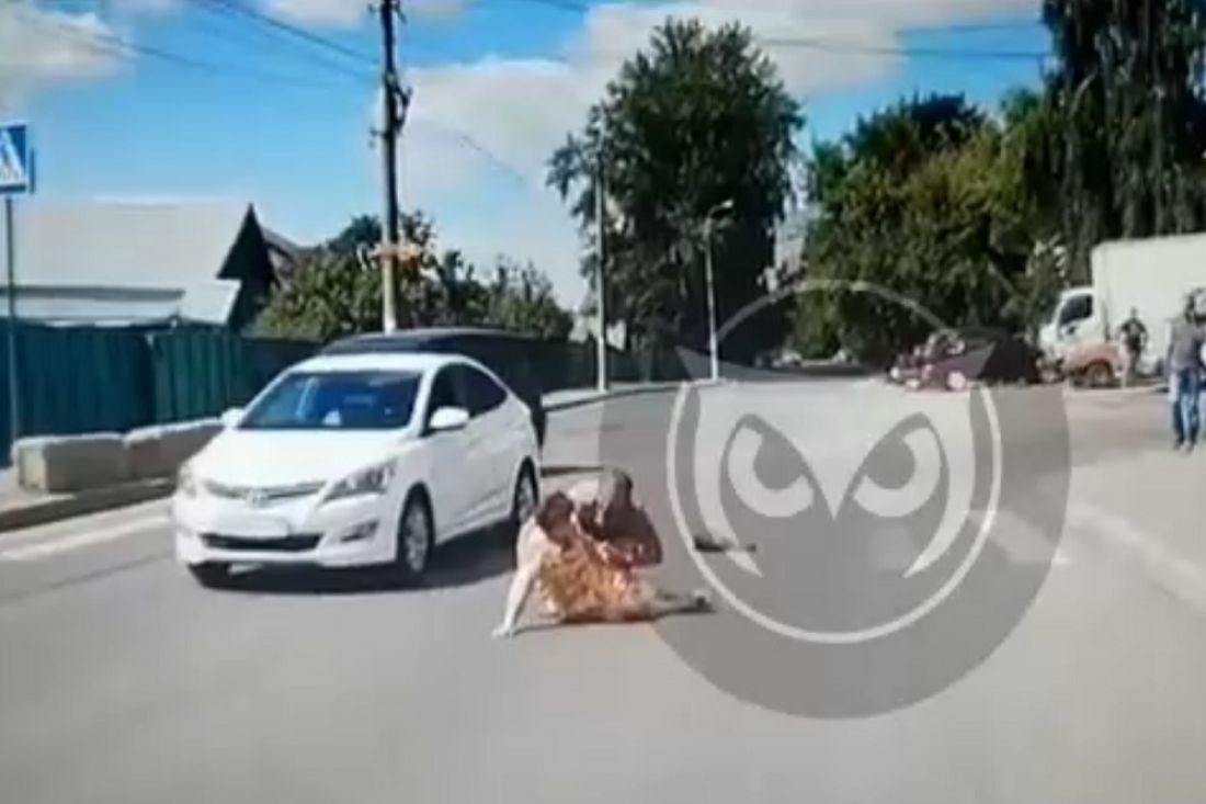Судя по ролику, предположительно, под колеса иномарки «Hyundai Solaris» попала женщина средних лет. Авария произошла прямо на пешеходном переходе. Видно, что пострадавшая сидит посреди проезжей части, в нескольких метрах от нее лежит сумка.