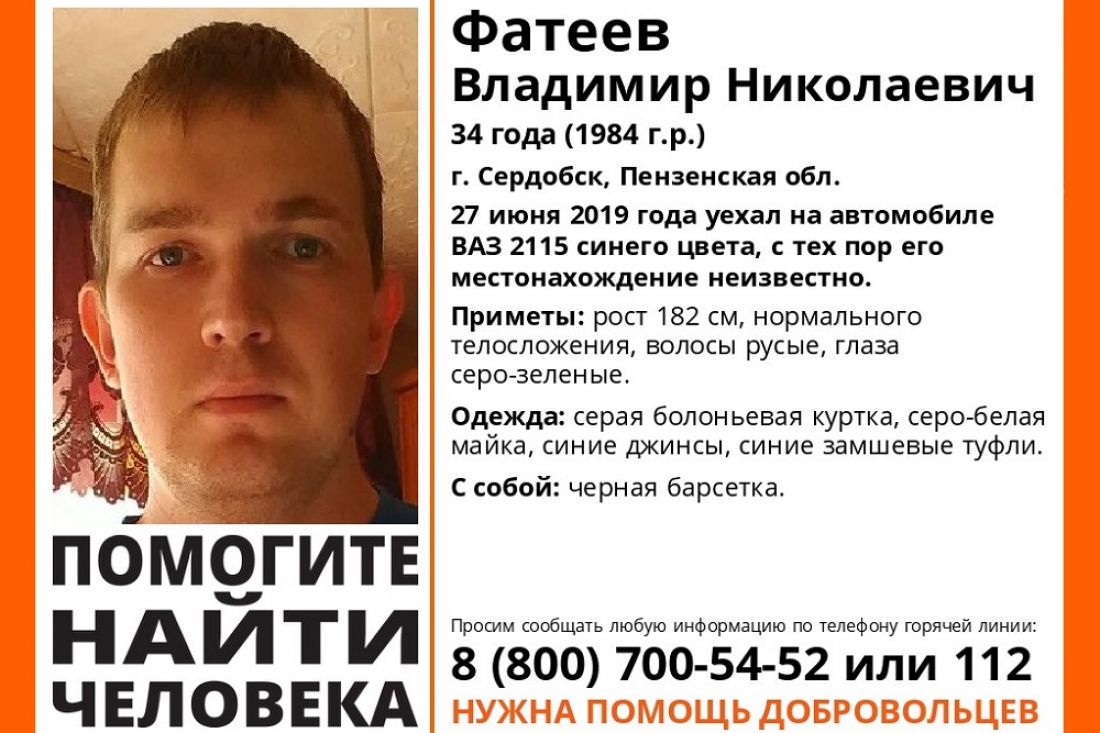 Добровольцы поискового отряда «Лиза Алерт» в социальной странице «ВКонтакте» сообщили о пропаже 34-летнего жителя города Сердобск Владимира Фатеева. 27 июня 2019 года он уехал из дома на машине «ВАЗ-2115» синего цвета, и с тех пор родные и близкие не знают о его местонахождении.