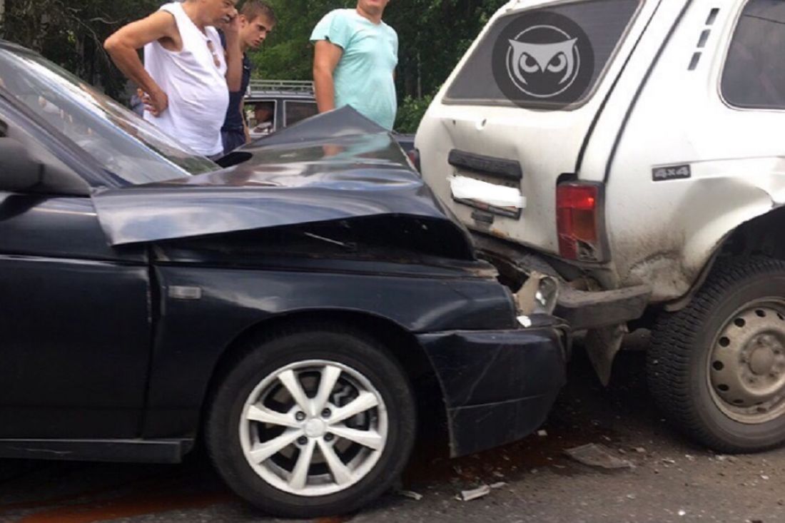 Видно, что автомобиль «ВАЗ-2112» врезался в «Ниву». Судя по фото, удар был сильным. У «двенадцатой» капот сложился в «гармошку», поврежден бампер, разбиты фары. Под машиной заметны следы разлившейся автомобильной жидкости. У «Нивы» искорежен багажник и задний бампер.