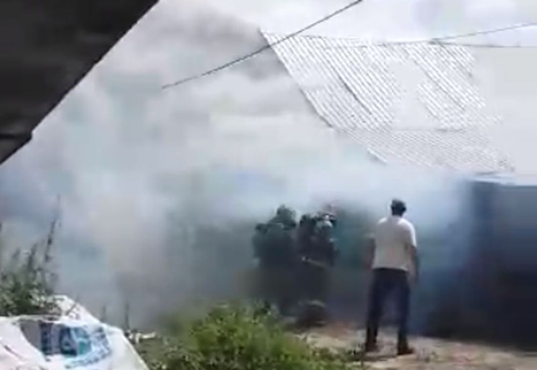 Клубы дыма и пламя вырываются из-под крыши строения.