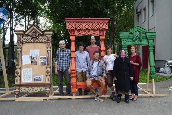 С утра возле зоопарка начала работать выставка наличников, тут же состоялись мастер-классы по ошкуриванию старых элементов резьбы и выпиливанию новых деталей.