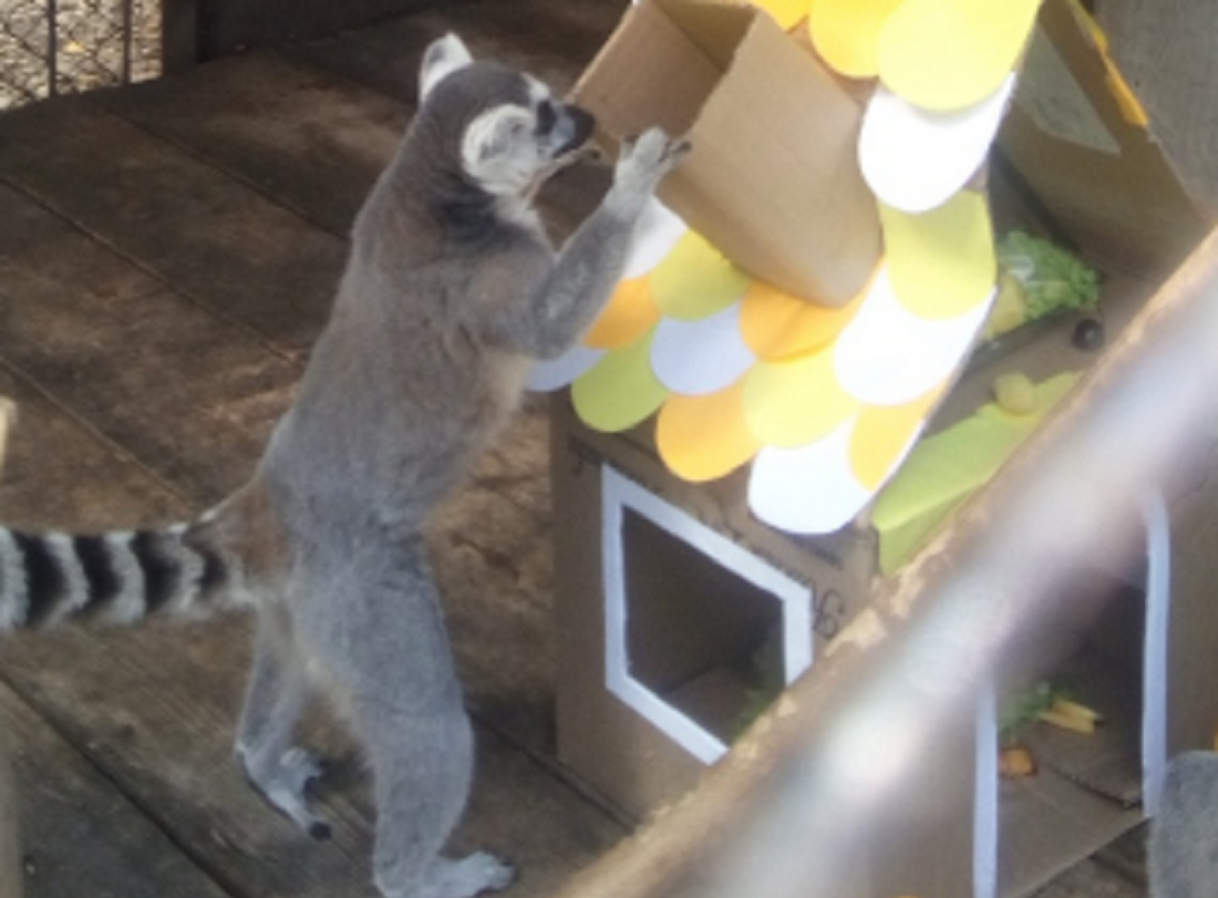 В зоопарке же живут две семьи лемуров. В общей сложности - четыре примата по имени Юмми, Фанни, Лео и Лулу. Они привыкли питаться углеводами. Для них приготовили фрукты в картонном домике, а потому им нужно было немного потрудиться, чтобы «добыть» себе еду.