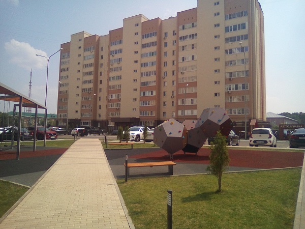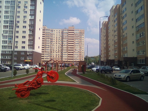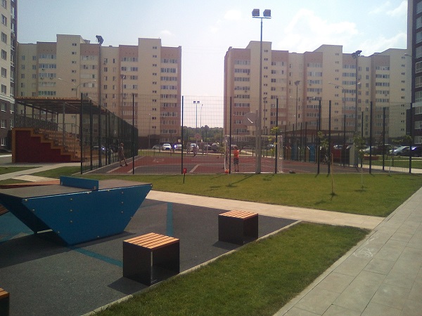 Двор жилого комплекса представляет собой парк, площадью более 2,5 гектаров, где есть детские и спортивные площадки, клумбы, дорожки для катания на роликовых коньках, а также тренажеры. Площадки двора застелены безопасным покрытием, максимально снижающим риск детского травматизма.