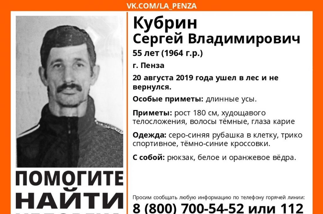 В группе пензенского отделения поисково-спасательного отряда «Лиза Алерт» социальной сети «ВКонтакте» появилось сообщение об исчезновении 55-летнего жителя Пензы Сергея Кубрина, который 20 августа ушел в лес за грибами и не вернулся.
