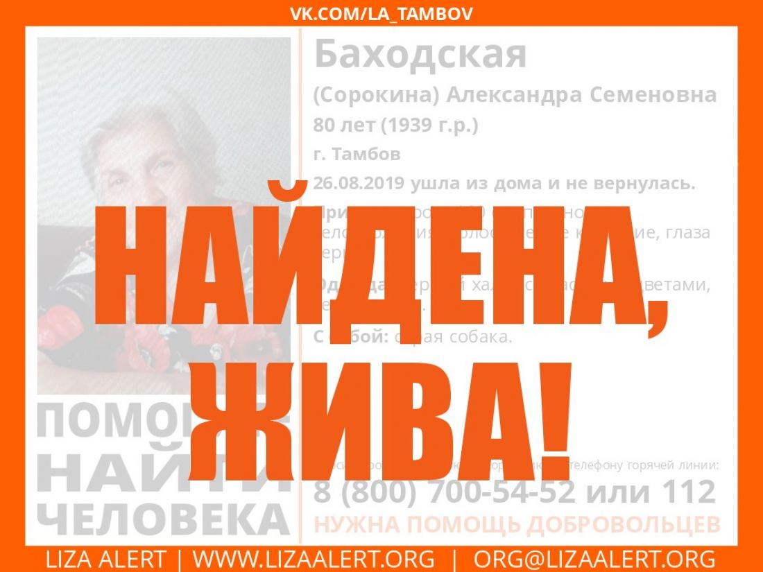 Пропавшая 26 августа в Тамбове 80-летняя женщина найдена. Об этом сегодня сообщили добровольцы отряда «Лиза Алерт» во «ВКонтакте». Как стало известно, Александра Баходская (Сорокина) вышла на прогулку со своей собакой и не вернулась.