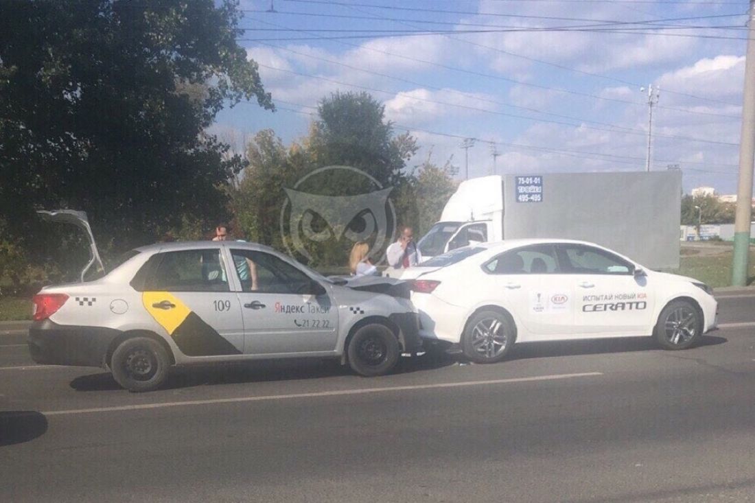 Напротив автозаправки «Лукойл» автомобиль марки «Datsun on-DO» с символикой «Яндекс.Такси» влетел в иномарку «Kia Cerato», предназначенную для тест-драйва.