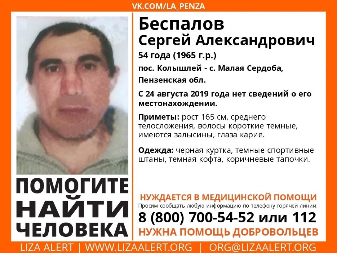 Добровольцы отряда «Лиза Алерт» сообщили о пропаже 54-летнего Сергея Беспалов, который мог находить в поселке Колышлей или селе Малая Сердоба. Информации о местонахождении мужчины, который нуждается в медицинской помощи, у родных нет с 24 августа, сообщается в официальной группе отряда во «ВКонтакте».