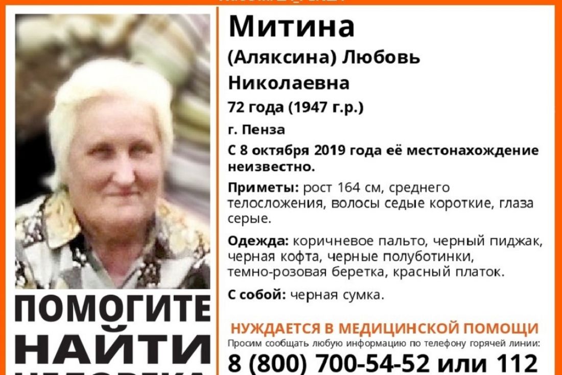 В группе пензенского отделения поисково-спасательного отряда «Лиза Алерт» в социальной сети «ВКонтакте» появилось сообщение о том, что в Пензе 8 октября пропала 72-летняя Любовь Митина (Аляксина).