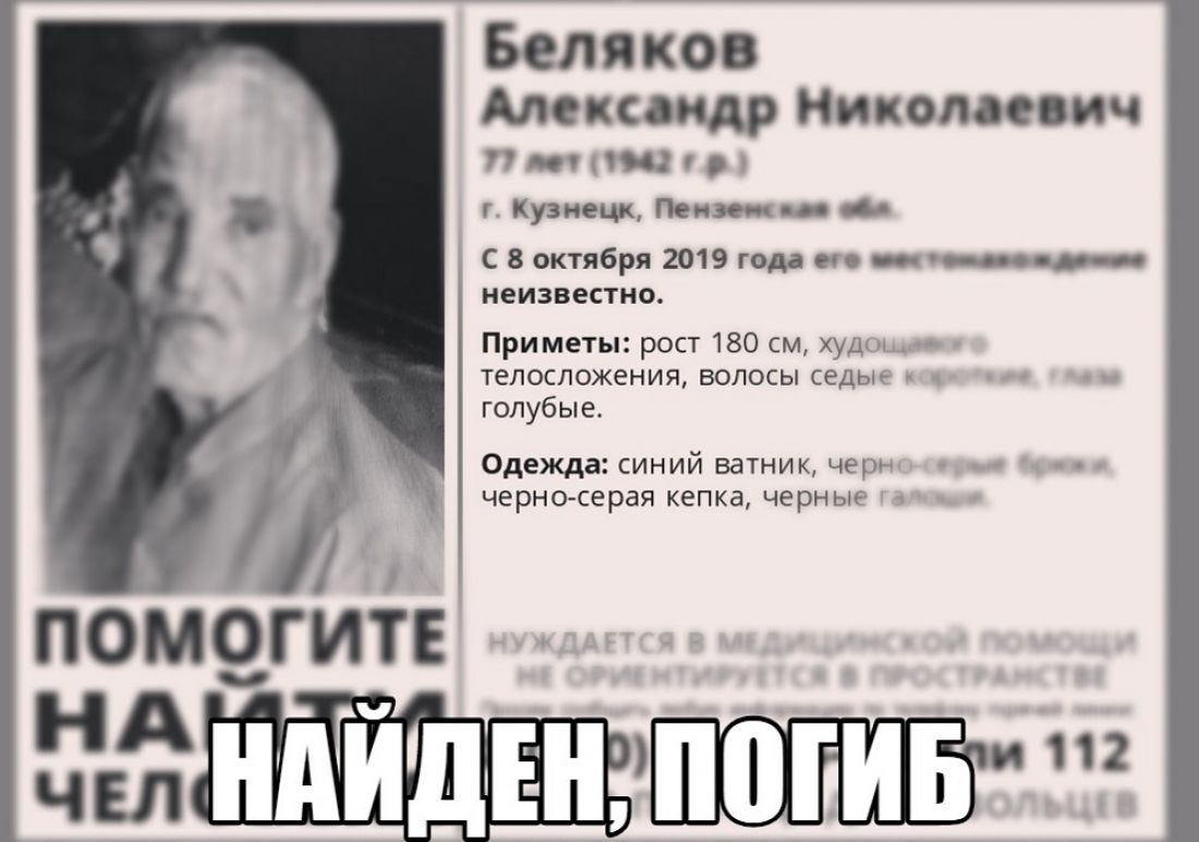 «Найден. Погиб» - такая надпись появилась на ориентировке на пенсионера в группе пензенского отделения поисково-спасательного отряда «Лиза Алерт. Пенза».