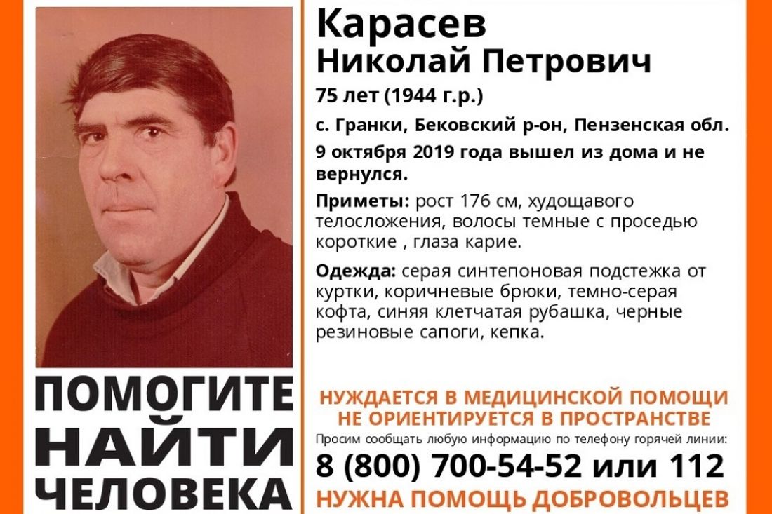 Добровольцы пензенского отделения поискового отряда «Лиза Алерт» объявили о поисках пропавшего 75-летнего Николая Карасева. Он исчез в селе Гранки Бековского района Пензенской области. Мужчина ушел из дома 9 октября 2019 года и не вернулся.