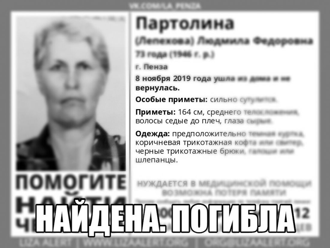 Сегодня утром стало известно о том, что в Пензе пропала 73-летняя жительница областного центра. Поисками Людмилы Партолиной занимались волонтеры отряда «Лиза Алерт».