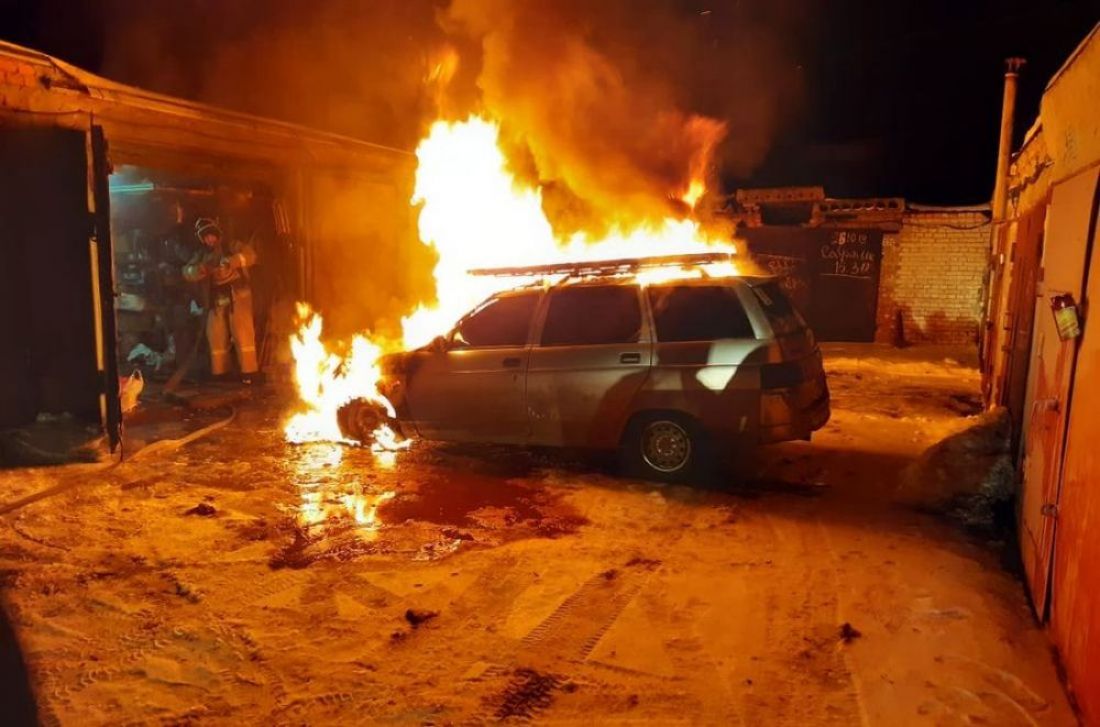 В Кузнецке рядом с гаражами вспыхнул автомобиль. Пожарные потушили огонь и обнаружили в машине человека.