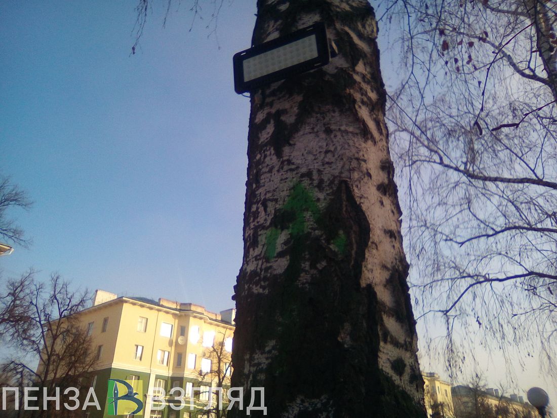 Современные светодиодные светильники прибиты гвоздями на сотку, что называется, «на живую». Мало того, видимо, организатор этих работ не надеялся на сообразительность исполнителей, поэтому пометил стволы берез зеленой краской.
