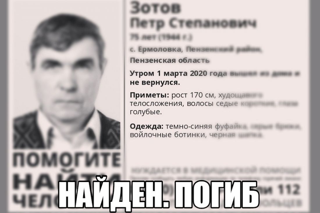 Пропавшего в воскресенье 75-летнего пенсионера из села Ермоловка Пензенского района нашли мертвым. Об этом сообщили добровольцы пензенского отделения поискового отряда «Лиза Алерт».